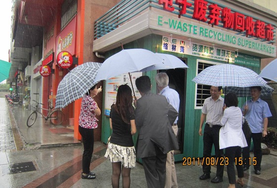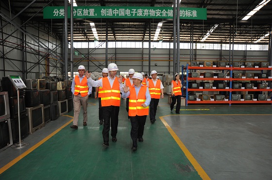 圖四 伯納德.??怂瓜壬ㄇ白笠唬?、許開華董事長(前右一)等參觀武漢分公司電子廢棄物倉庫