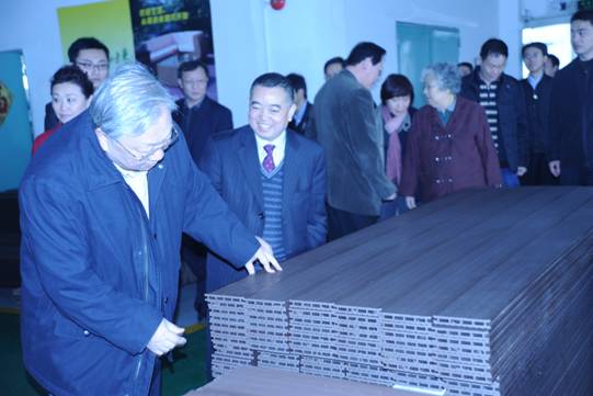 圖1. 路委員長(左一)參觀塑木生產(chǎn)車間,并聽取了董事長許開華對國家創(chuàng)新產(chǎn)品塑木型材的介紹